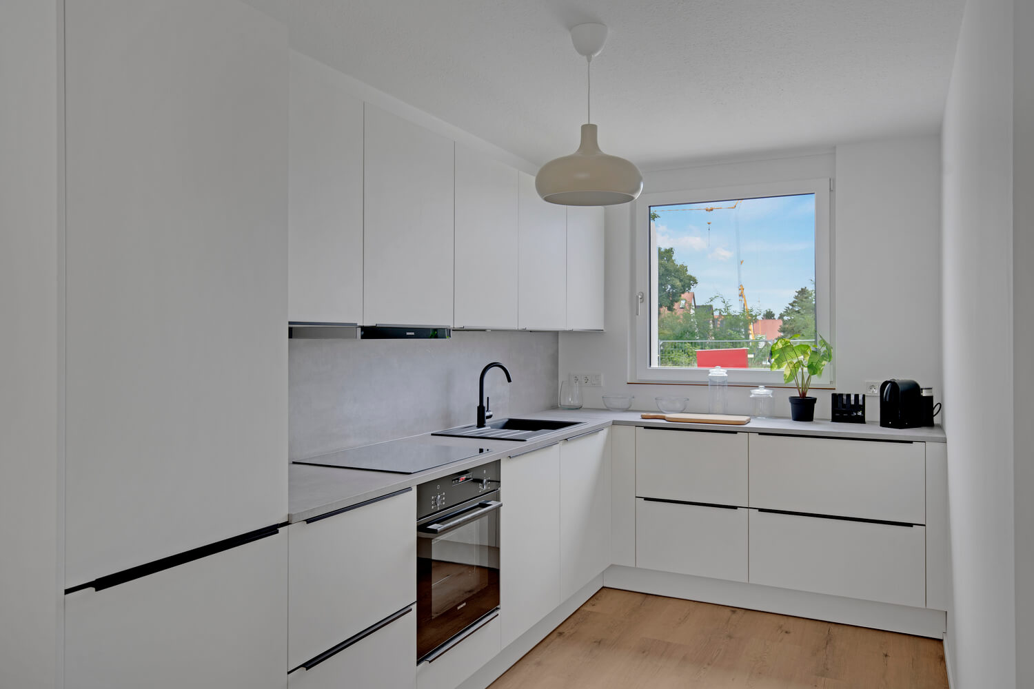 - Mattweiße Küchenfronten mit schwarzen Griffleisten